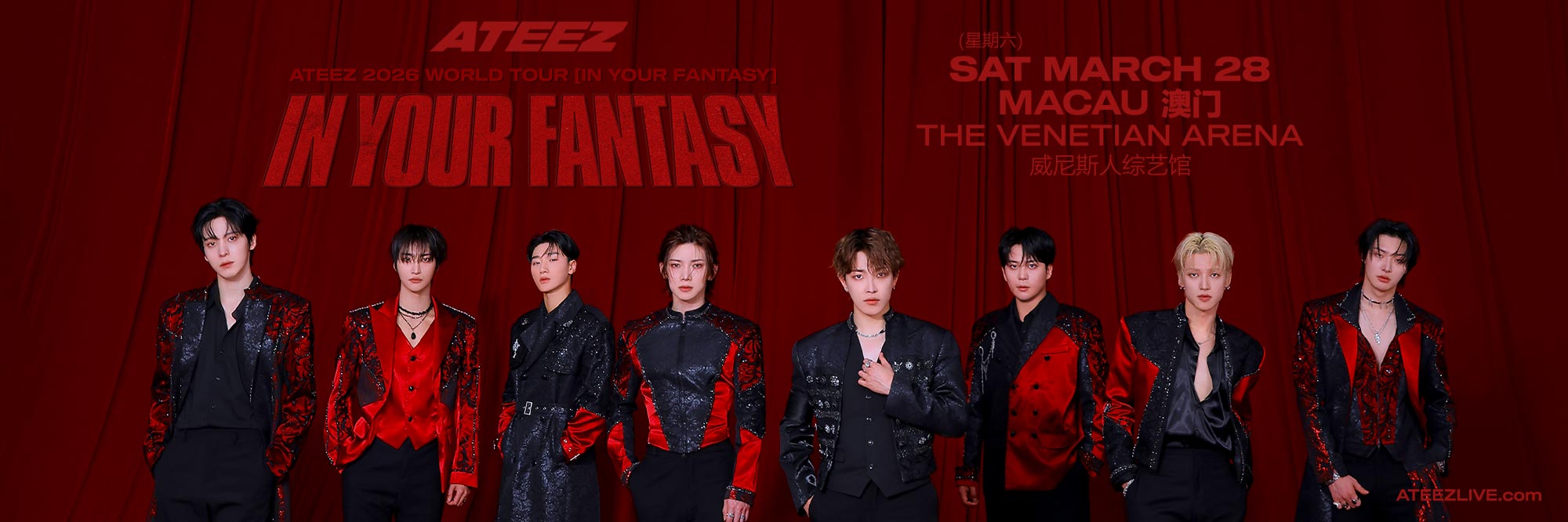 由 AEG Presents Asia 主办,2026 ATEEZ世界巡回演唱会 [IN YOUR FANTASY] - 澳门站 将于 2026 年 3 月 28 日(星期六) 在威尼斯人综艺馆(The Venetian Arena) 盛大举行。